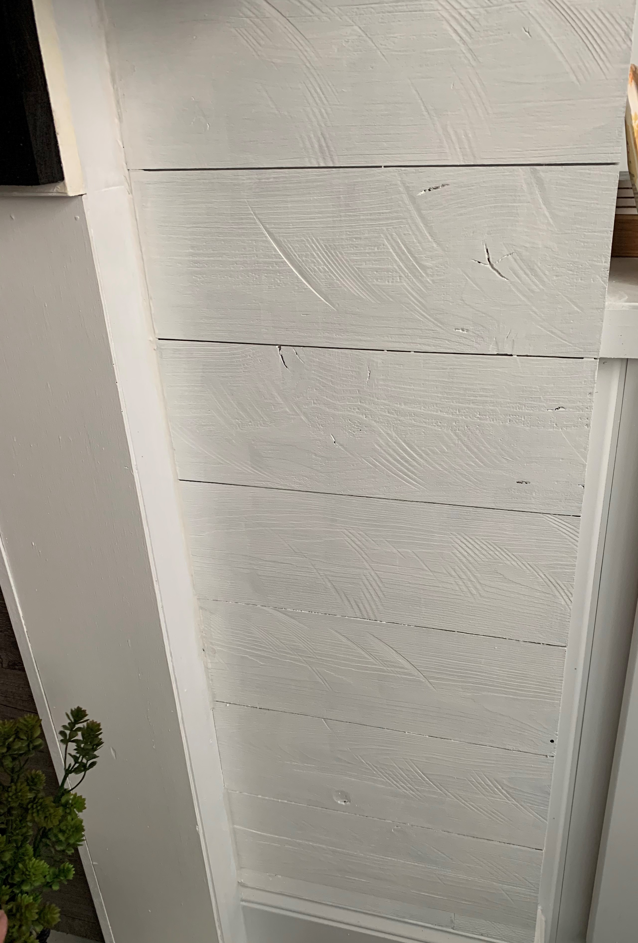 Next, I started painting. I used white, semi-gloss trim paint. I planned to paint one coat on it all before caulking. I wanted the shiplap to have a continuous look to it, so I was planning on caulking between the boards where they meet horizontally.