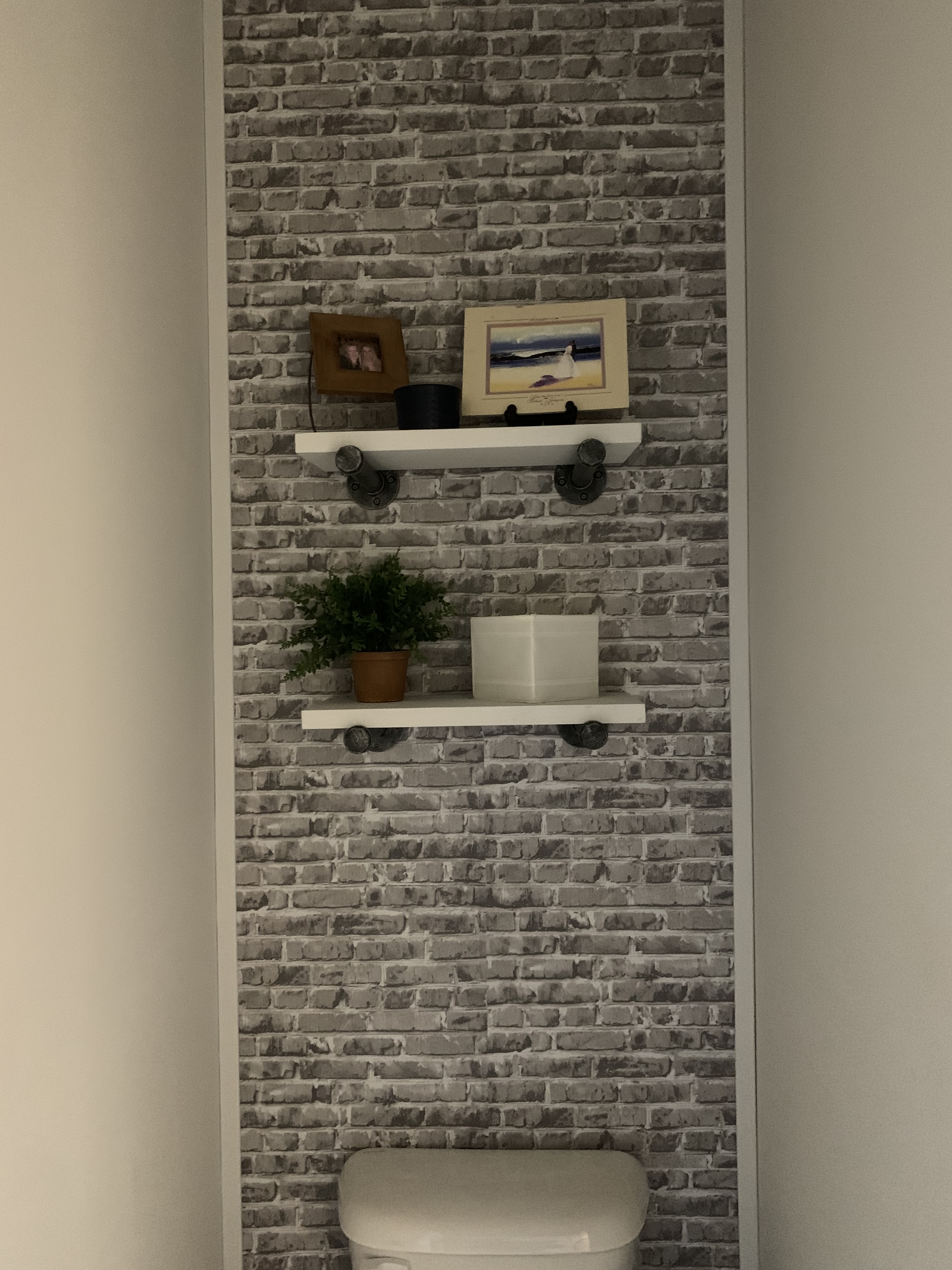 So, I decided to take a chance on something that I probably wouldn’t be willing to chance on in a more public space of our house. I found this sticky brick wall paper on lightning deal on Amazon, for a whopping $11. I read the reviews and looked at people’s pictures and decided to go for it. Now, this isn’t 3-D brick wallpaper or anything. It is printed-on bricks that you know aren’t real, but are able to give you the brick effect.