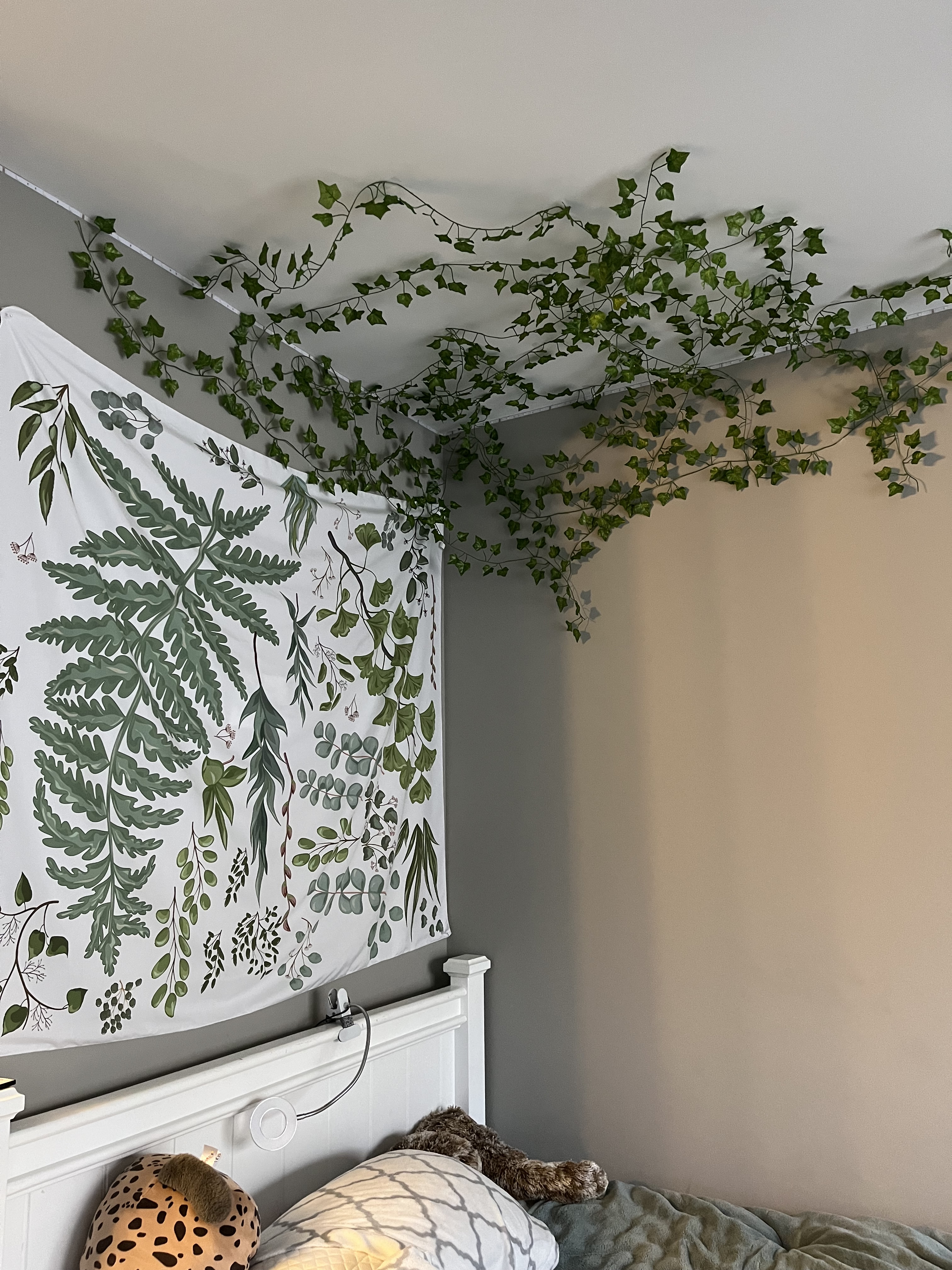 Now, however, she made the two go together! She hung the tapestry over her bed, and then extended the vines out from it, onto her ceiling! She used clear masking tape to hold the vines on.