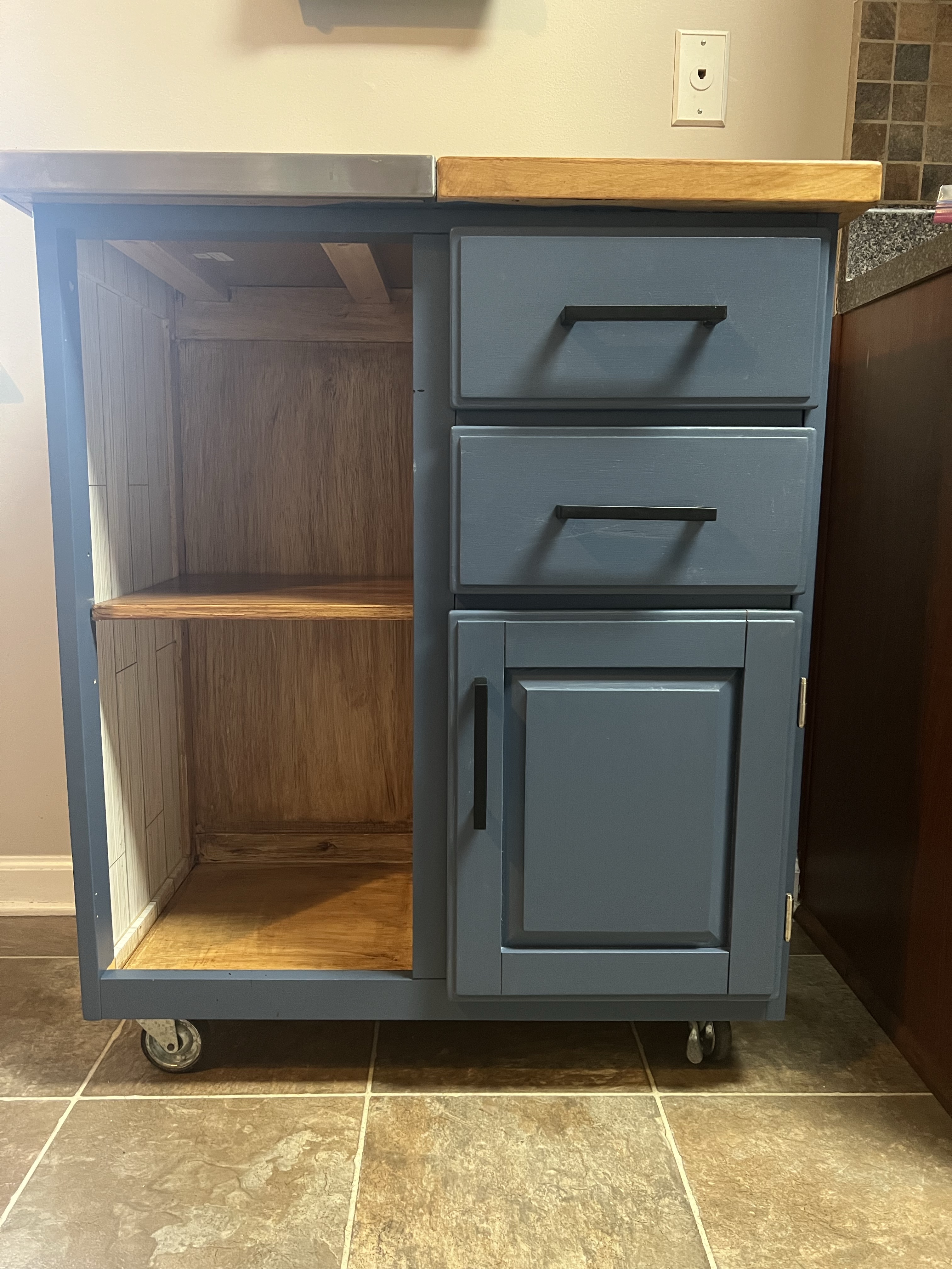 She used the blue paint that she used for her pantry door. She painted the drawers, the door, and the sides of the cart blue.