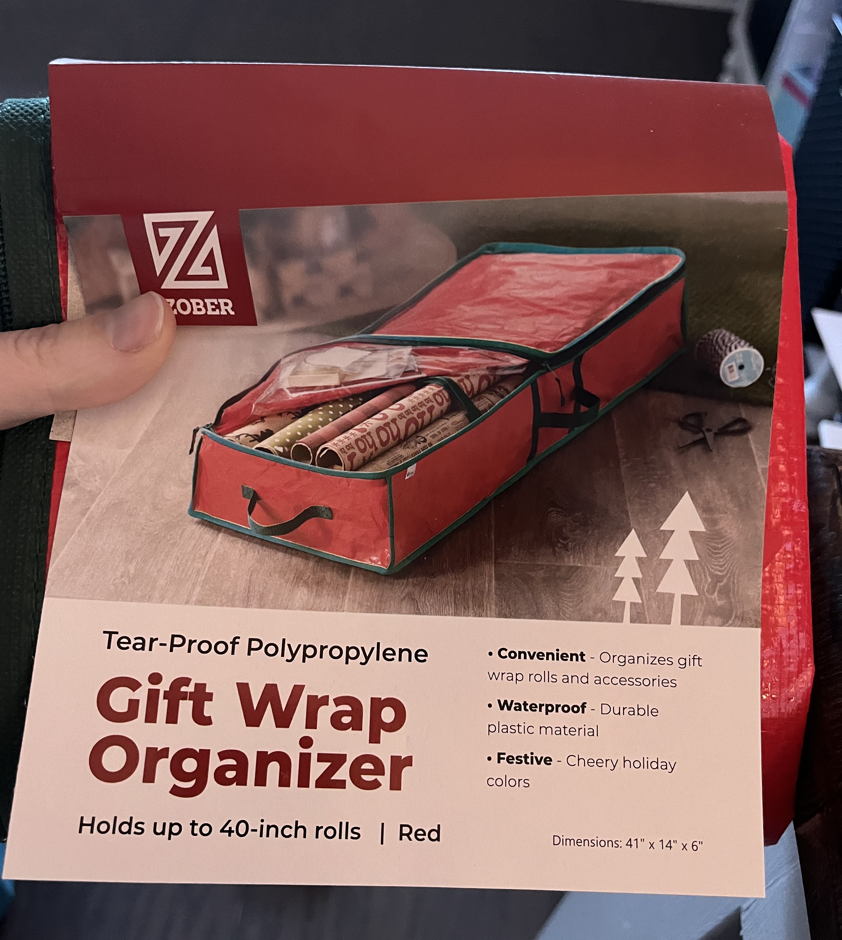 I purchased this gift wrap organizer from Amazon, and it’s a great way to organize wrapping paper rolls, tissue paper, gift bags, bows, and more!